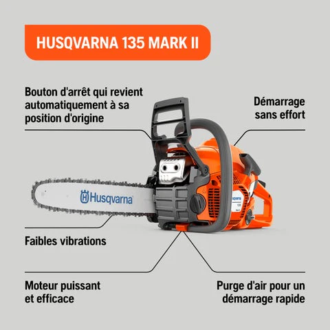 De Husqvarna 135 Mark II Benzine Kettingzaag is een robuuste, betrouwbare en gemakkelijk te gebruiken zaag. De kettingzaag biedt ruime snijprestaties en is ideaal voor incidentele snijtaken zoals het zagen van brandhout en het kappen van kleinere bomen. Start snel en is gemakkelijk in gebruik. Dankzij de op de zijkant gemonteerde kettingspanner is het spannen van de ketting zowel snel als eenvoudig.