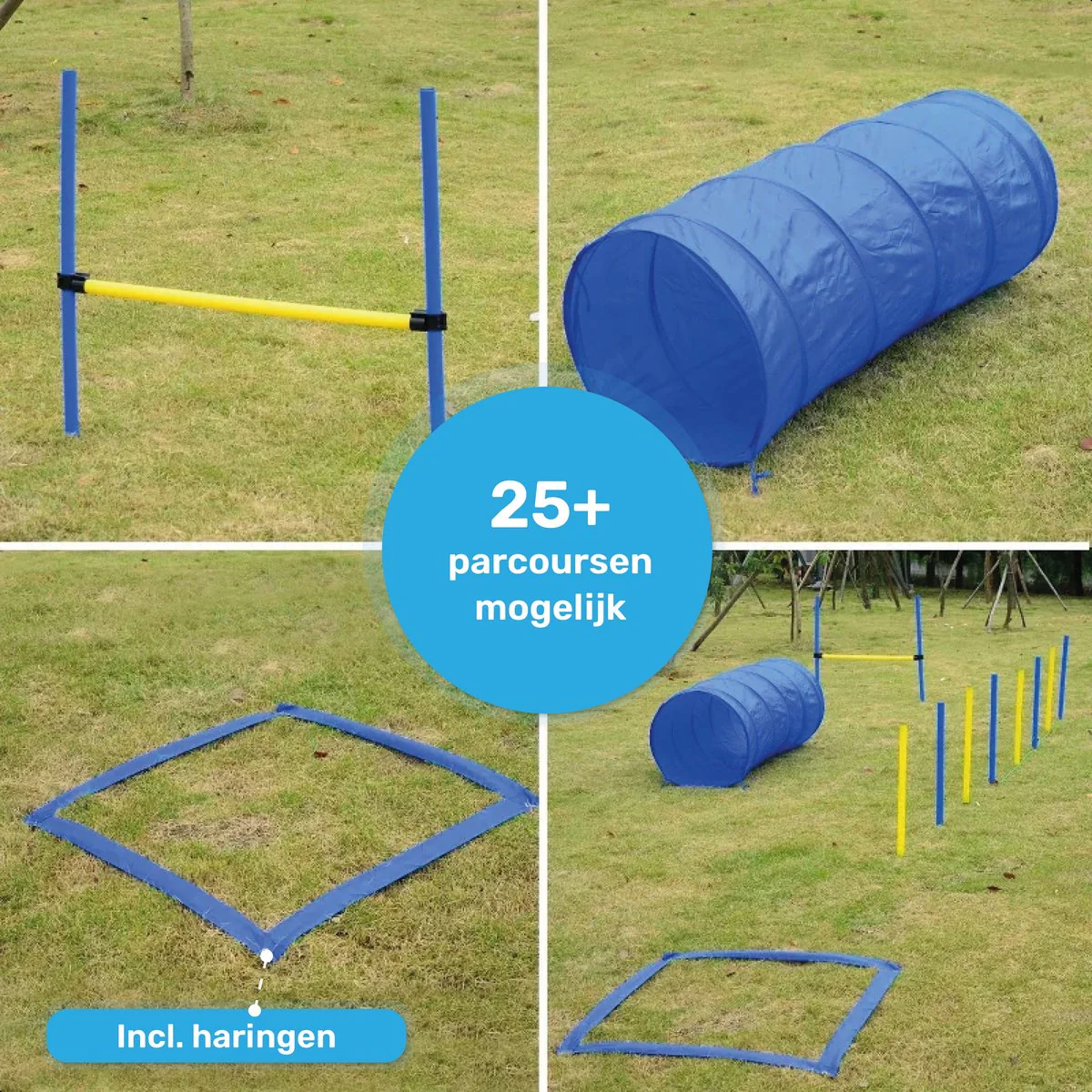 De behendigheid training set is gemaakt uit materialen van kunststof en polyester en zijn onder strenge voorwaarden gekeurd. De set is 100% veilig en geschikt voor elke hond, van kleine tot grote honden. Het sterke materiaal kan eenvoudig worden opgeborgen door de 2 opbergtassen die worden meegeleverd voor de tunnel en de overige materialen. Waar wacht je nog op? Ga aan de slag en gun je viervoeter en jouzelf een dosis plezier!