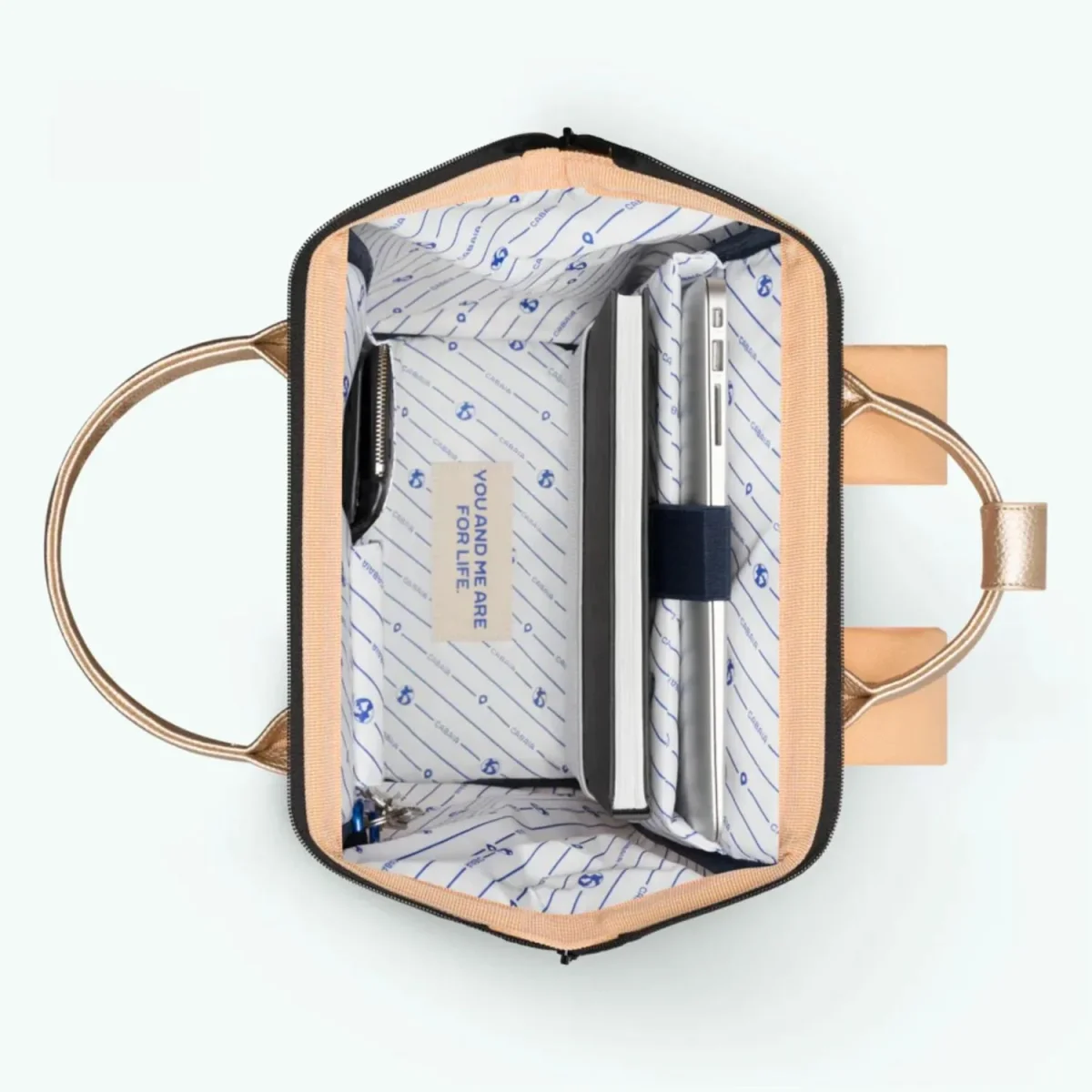 Dankzij de beugelopening blijft de tas stevig open staan wanneer je hem neerzet. Zo pak je eenvoudig je laptop, boeken of andere essentials.