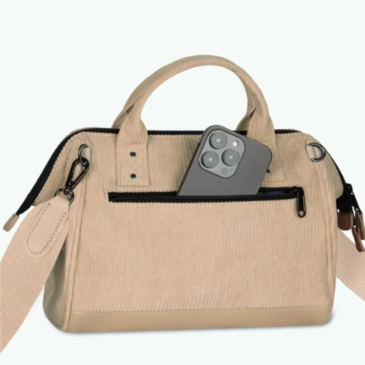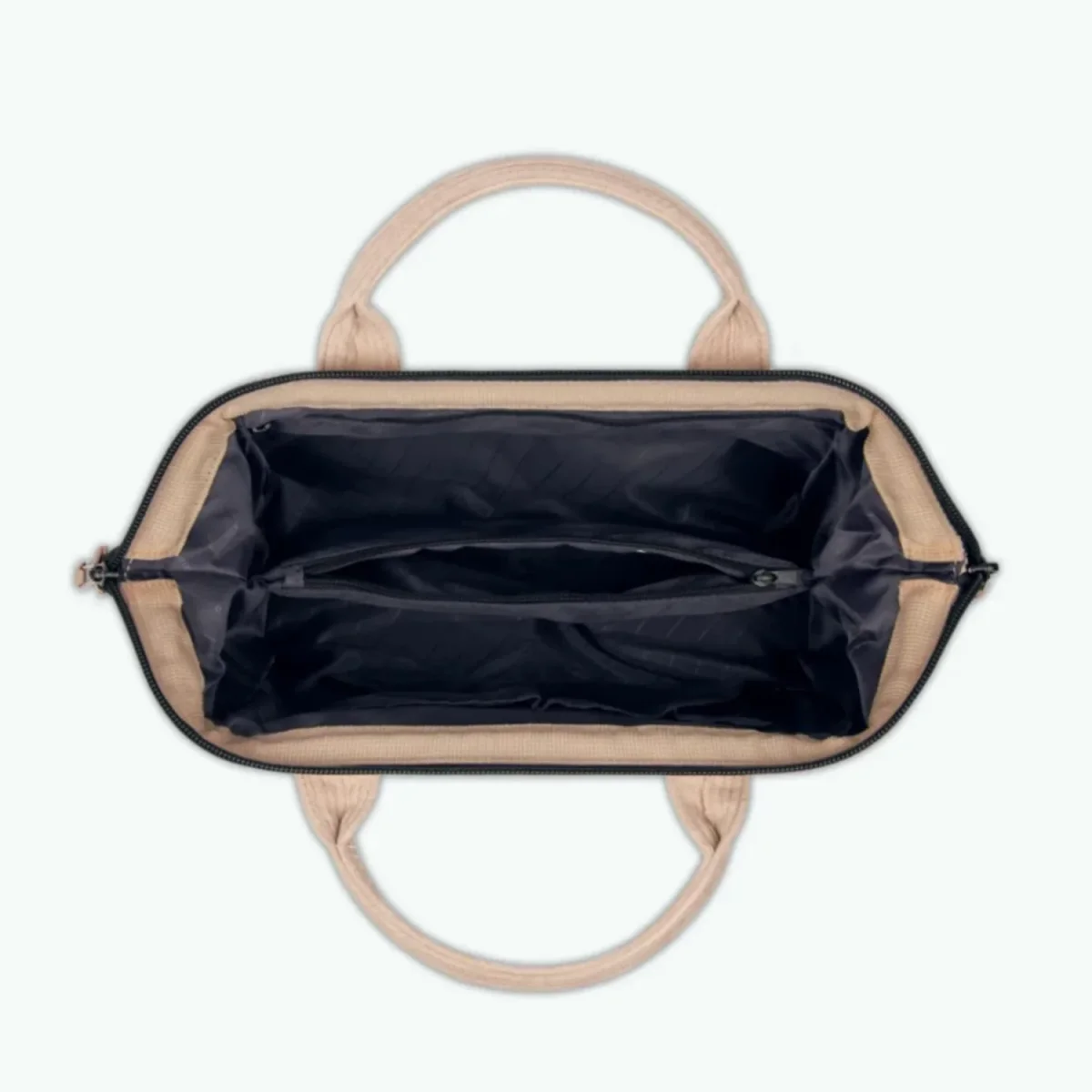 • Binnenin: middenvak met ritssluiting, 2 steekvakken en een ritsvakje