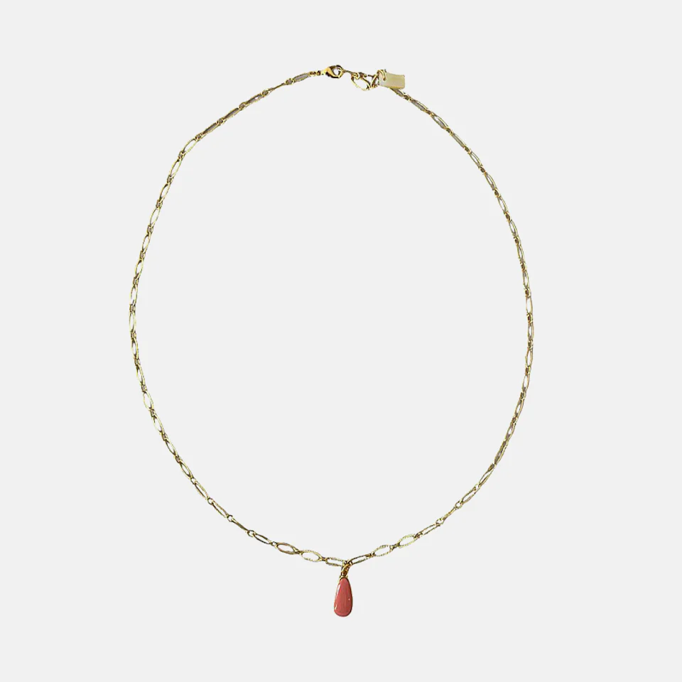 Deze goudkleurige ketting is 25,5 cm lang, en heeft een druppelvormige emaille hanger van zo’n 1,5 cm groot. Er zit een parelmoer Jazu logo hangertje aan het uiteinde.