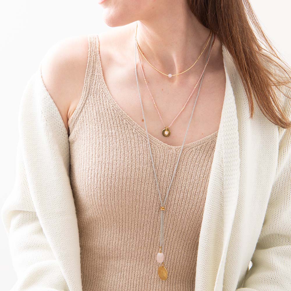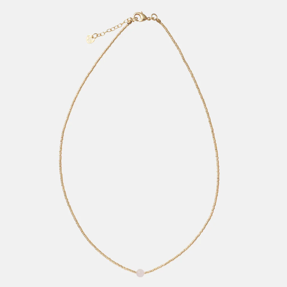 Deze ketting is van glaskralen en een kleine rozenkwarts edelsteen.
