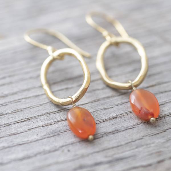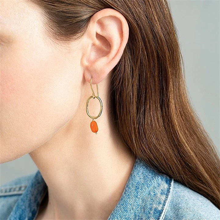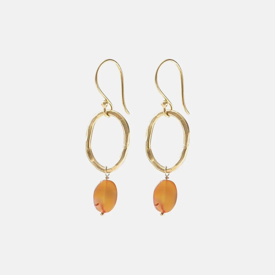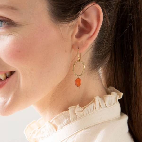 De Graceful Carnelian Gold Earrings zijn messing vergulde haakoorbellen met een grote ovale ring. De oorbellen hebben een carneool edelsteen, deze steen staat voor moedig en creatief.
