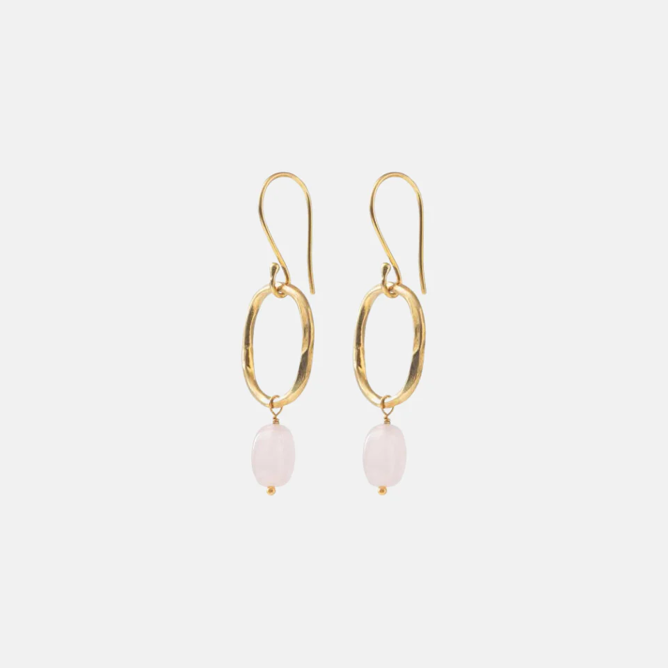 Dit zijn messing vergulde haakoorbellen met een grote ovale ring met een rozenkwarts edelsteen.