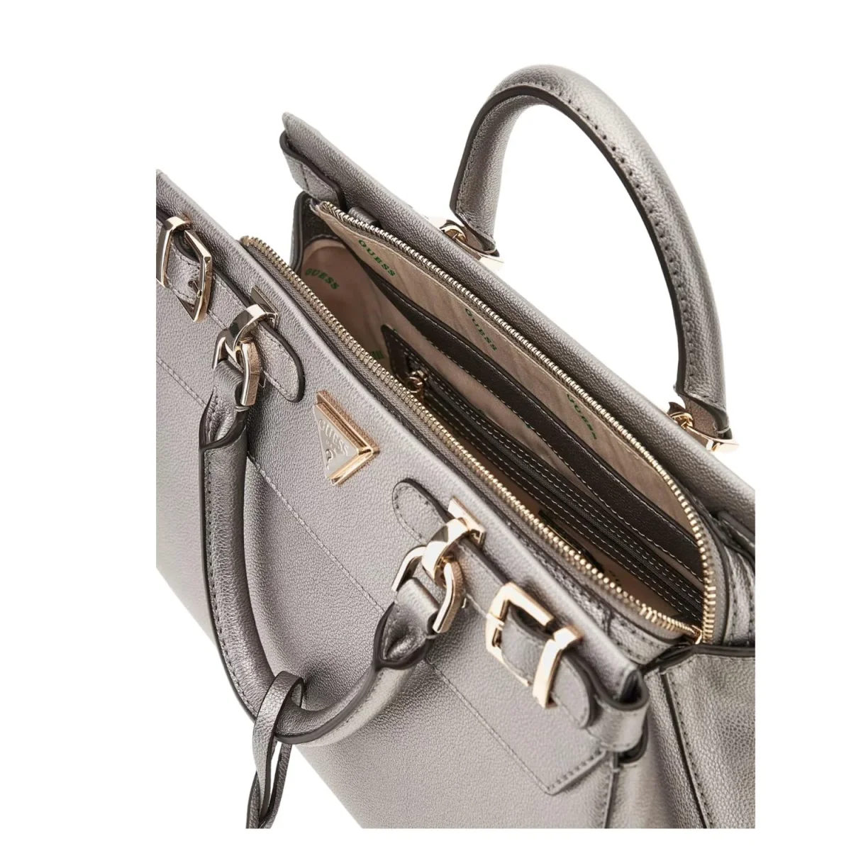 Wauw! Deze zilveren Eco ali handtas van Guess is een echte eyecatcher. De tas heeft prachtige details, zoals de lichtgouden gespen en de afneembare sleutelhanger die de tas helemaal af maken!