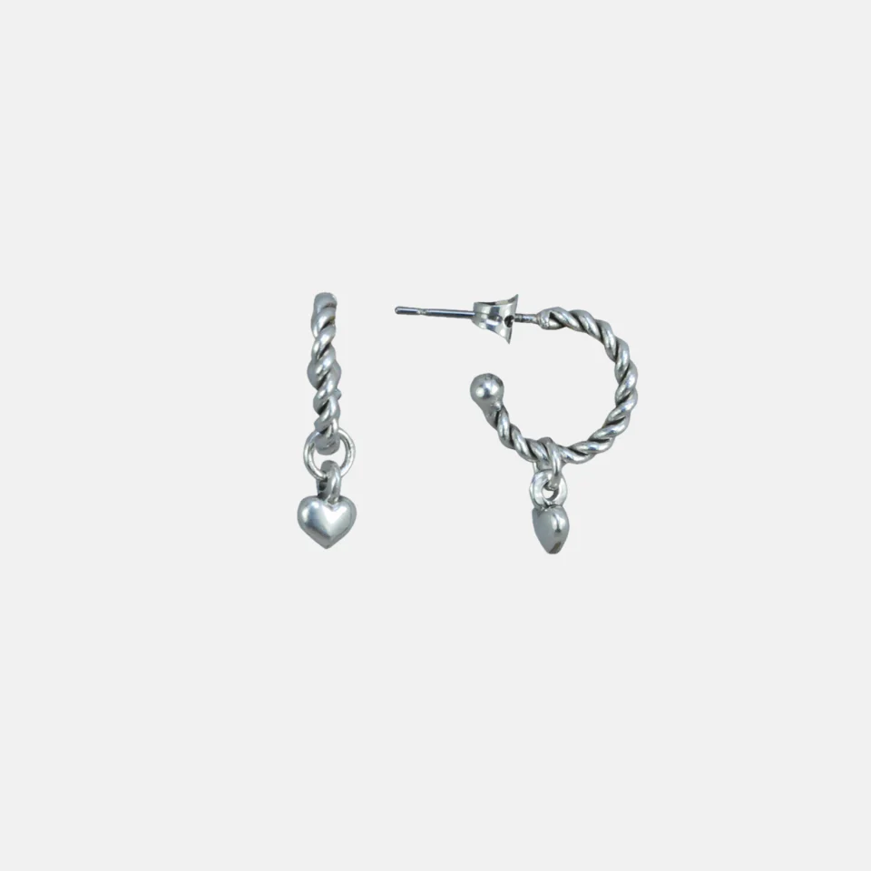 Gedraaide oorring met steker en butterfly sluiter. Aan het ringetje hangt een hartjes bedeltje. De oorbel is 2 cm lang.