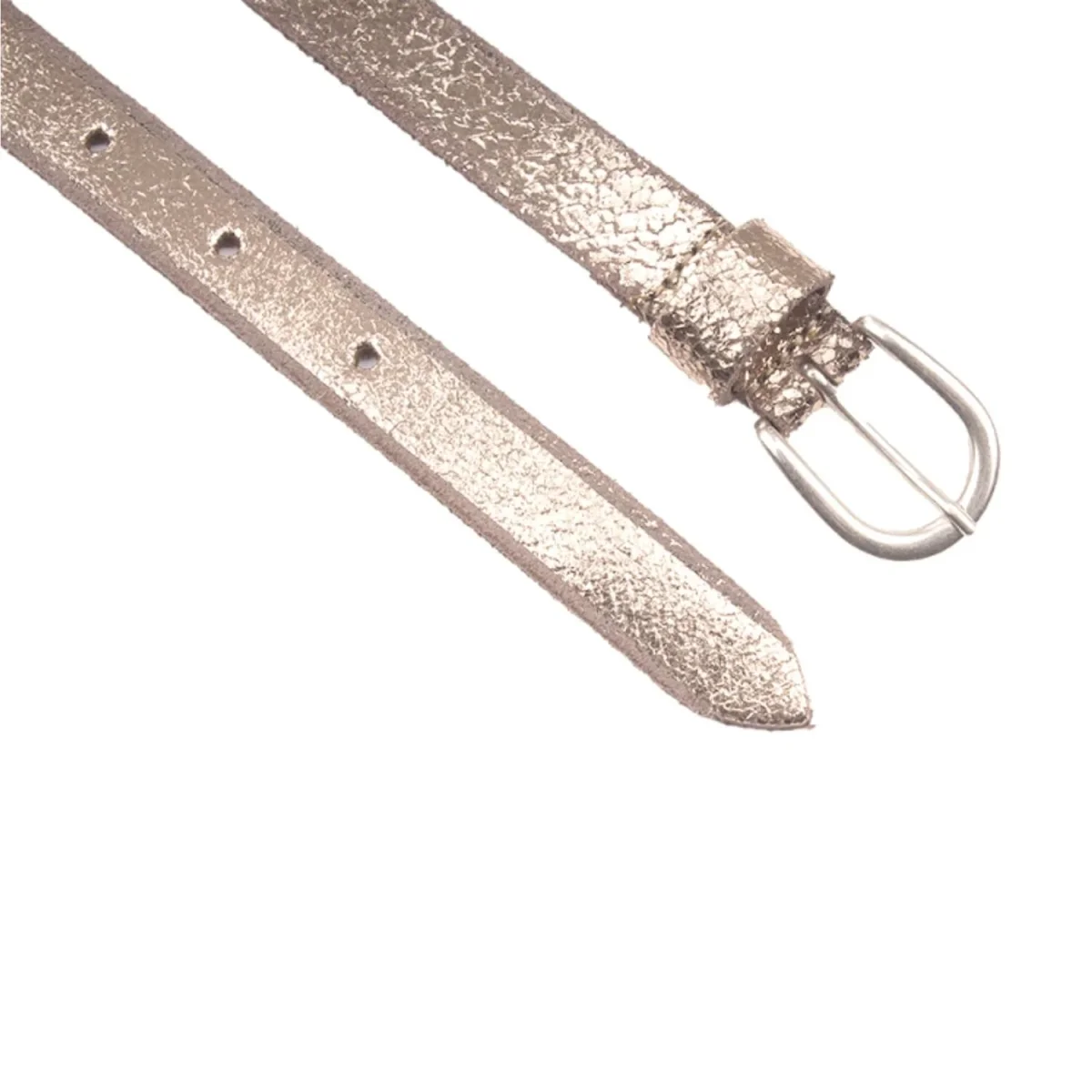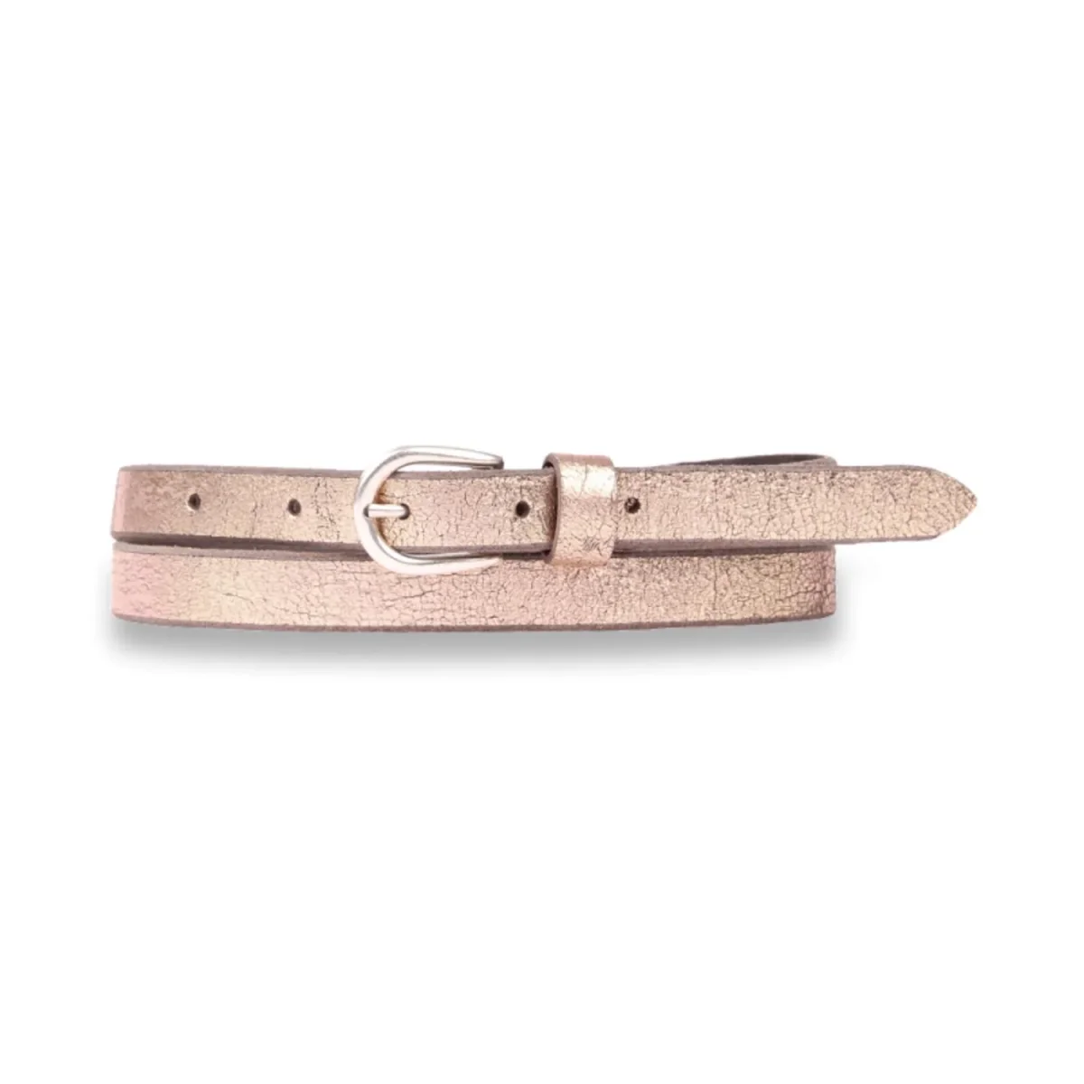 Damesriem in een metallic kleur. De riem kan als smalle riem in een broek, maar ook prima als tailleriem bij je favoriete jurkje. Zowel sportief als chique. Gemaakt van echt leer en met een nikkelvrije gesp.