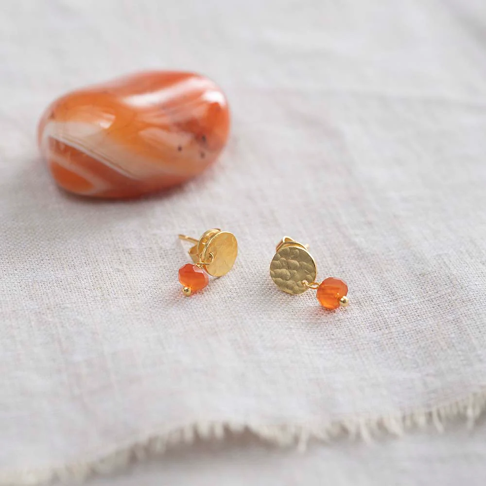 Deze Mini Coin Carneool Goud Oorbellen van A Beautiful Story zijn kleine oorknopjes met lengte van 1,5 centimeter. De knopjes hebben een goudkleurig muntje en een kleine carneool edelsteen.