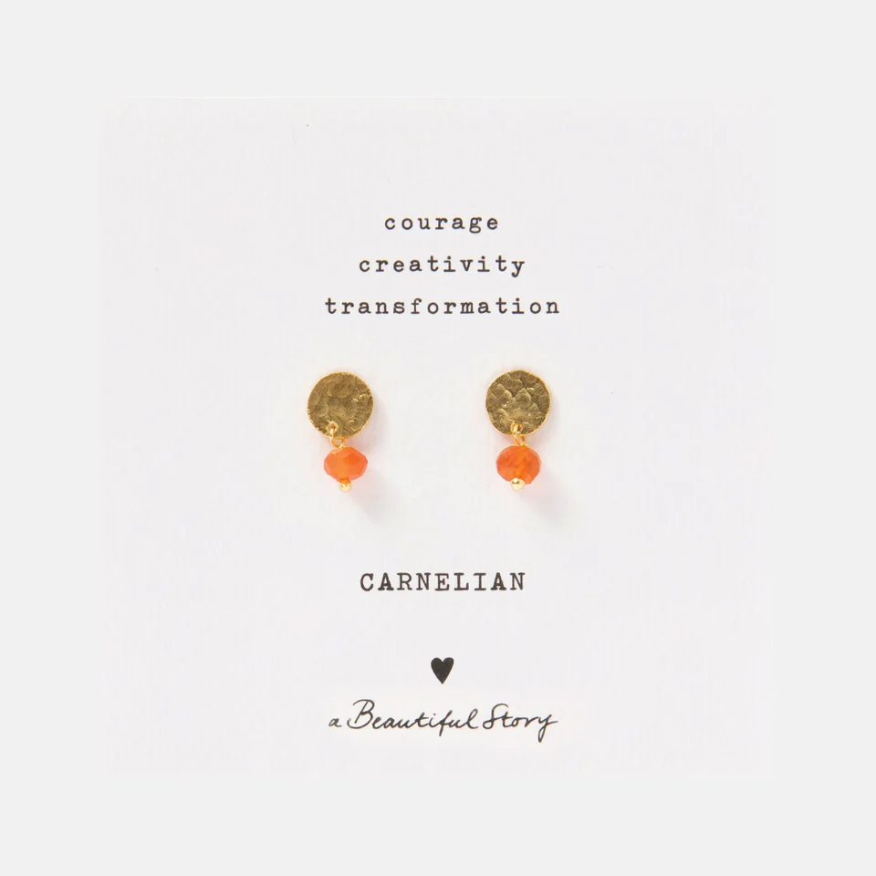 De oorstekers zijn bevestigd op een papieren kaartje waar de betekenis van de edelsteen in drie woorden op staat.