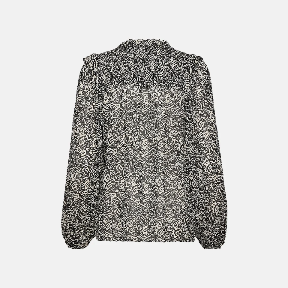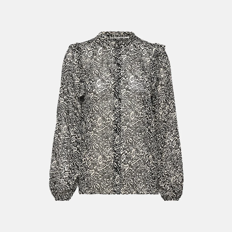 De blouse matcht met de Mirta skirt. Volledig doorschijnende blouse, singlet is aan te raden. Ruches op de kraag en schouders en een speels pofmouwtje.