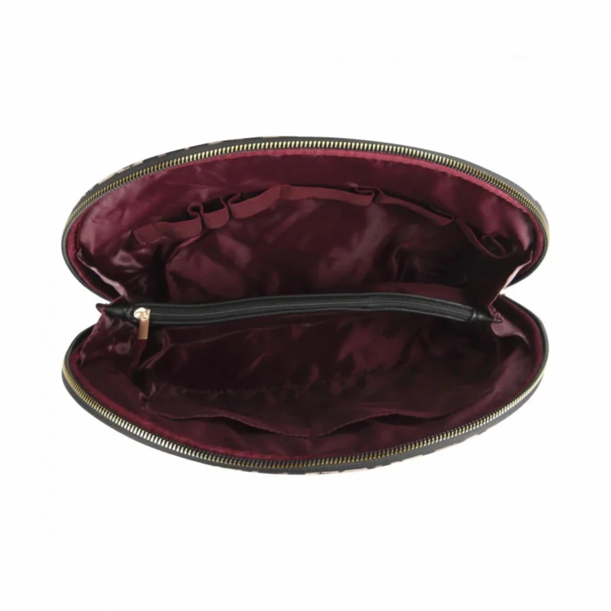 De lichte en ruime toilettas Ise van Mosz is gemaakt van nylon en heeft een stijlvolle ronde rits voor een makkelijke opening. Dankzij het slimme ontwerp blijft de toilettas makkelijk open staan, zodat je direct al je spullen overzichtelijk kunt zien en gebruiken. Binnenin vind je twee handige steekvakken, een ritsvak in het midden en elastieken om je toiletartikelen stevig op hun plek te houden. De mooie, opvallende panterprint gecombineerd met het leuke doorgestikte ruitjespatroon geeft de tas een speelse en stijlvolle uitstraling!