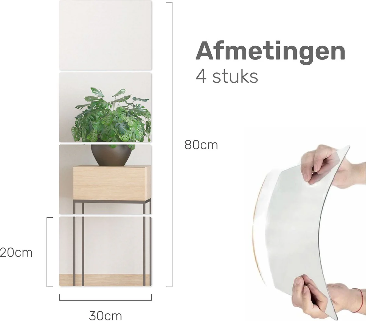 Breng stijl en functionaliteit naar je huis met onze Plakspiegel Set van 4. Deze zelfklevende spiegels zijn perfect voor gebruik in slaapkamers, badkamers, gangen en andere ruimtes waar je behoefte hebt aan een handige en stijlvolle spiegeloplossing.