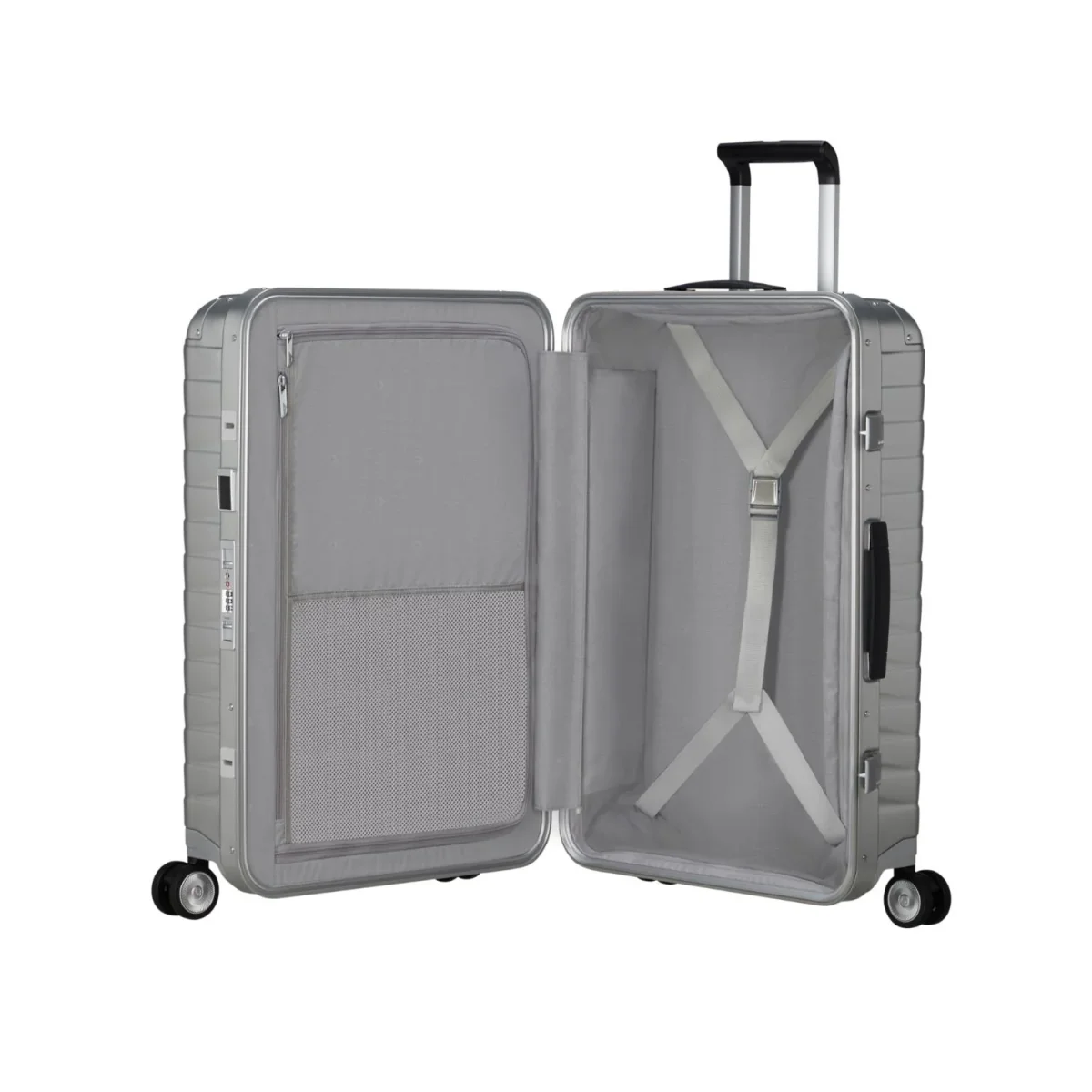 Deze harde koffer combineert het kenmerkende design van Proxis met een mooie aluminium afwerking van topkwaliteit. Zo is de koffer voorzien van extra verstevigde hoeken, een TSA-slot en een dubbele trekstang. De Proxis koffer is niet alleen sterk en veilig, maar ook erg comfortabel in gebruik! De 4 soepele en stille softwieltjes rollen fijn met je mee zodat je deze niet achter je aan hoeft te trekken. Daarnaast heeft de koffer een georganiseerde indeling inclusief een verwijderbaar tussenschot. De verstelbare trekstang en het handvat aan de zij- en bovenkant zorgen er daarnaast voor dat je de koffer eenvoudig met je meeneemt.