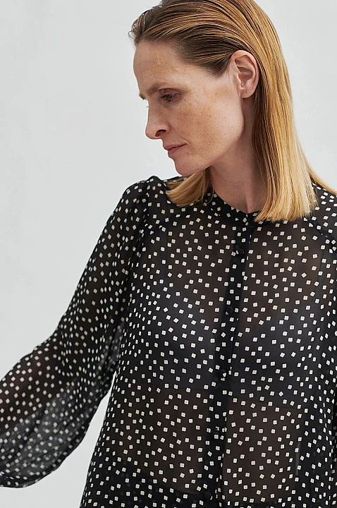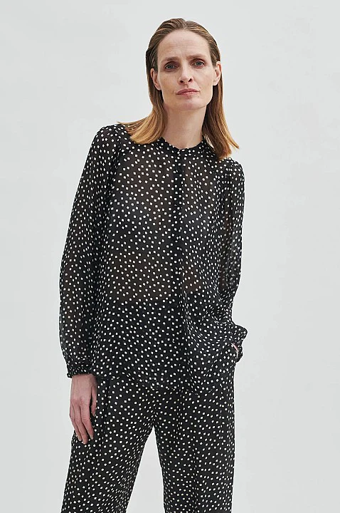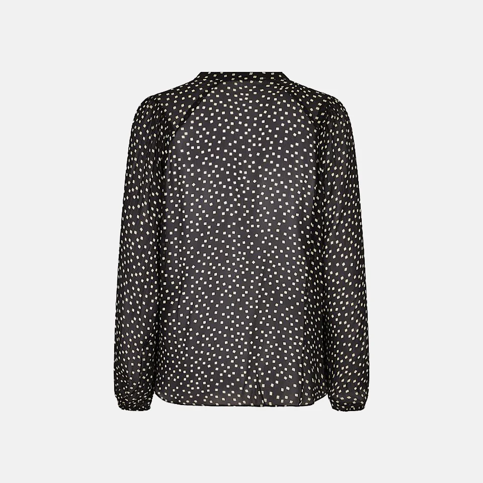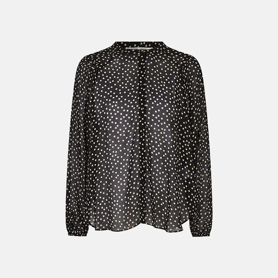 Speelse blouse met blokjes print. De blouse heeft een ronde hals en een knoopsluiting.