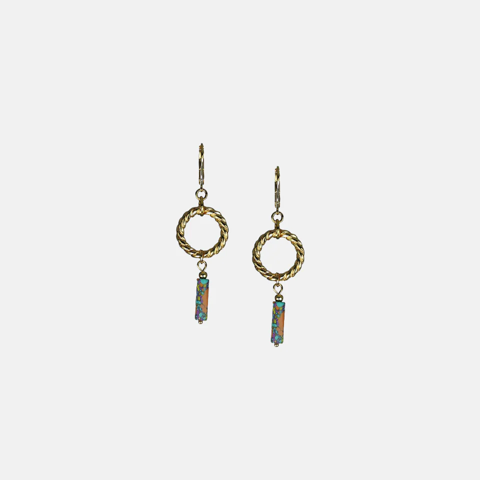 Deze kleurrijke oorbellen hebben een gedraaid ringetje van 1,5 cm diameter, met daar aan een multi colour kraaltje. Let op: elk kraaltje is uniek en kan verschillend met de foto.