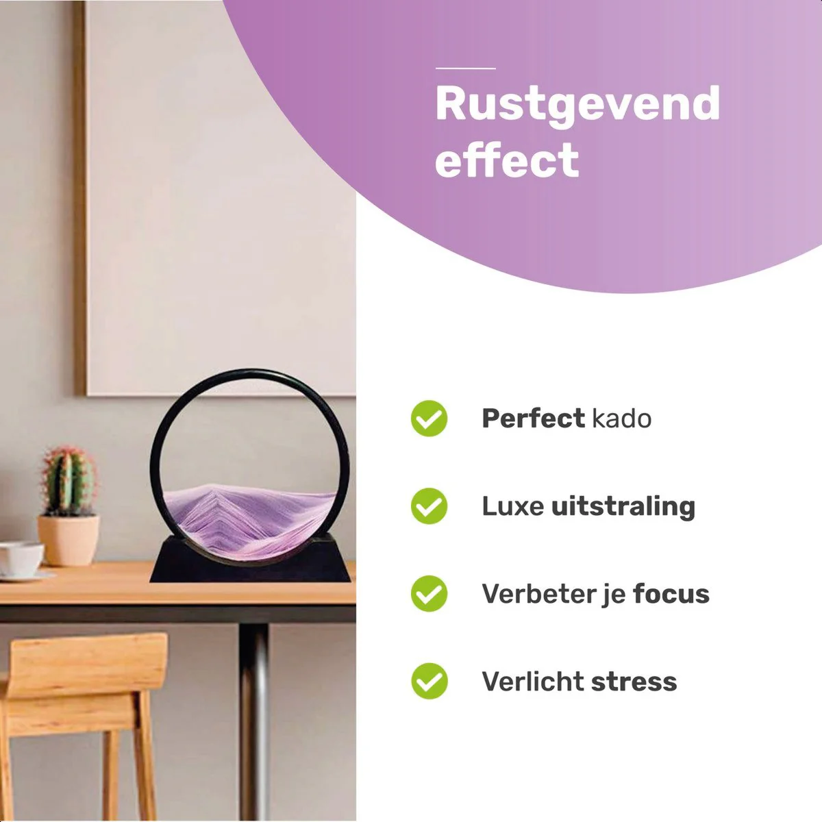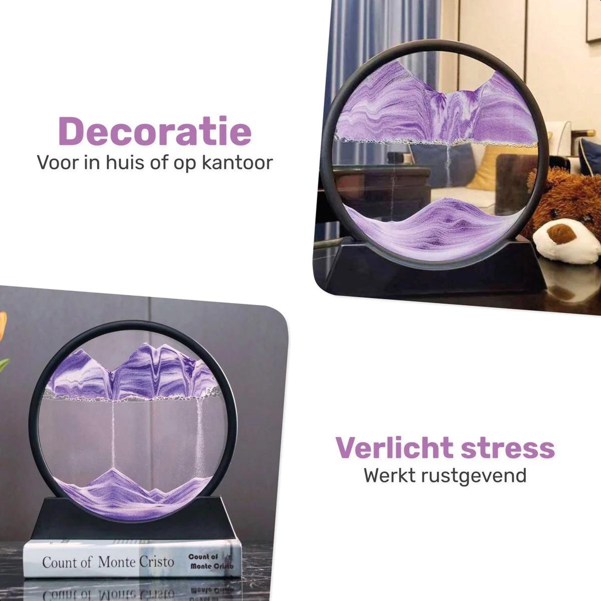 Breng een vleugje creativiteit in uw interieur met onze unieke paarse Zandkunst in glas! Deze opmerkelijke kunststukken zijn prachtig vormgegeven en hebben een diameter van 30 cm, compleet met een stijlvolle houder. Geniet van de rustgevende schoonheid van deze kunstwerken en ervaar hoe ze elk interieur transformeren.